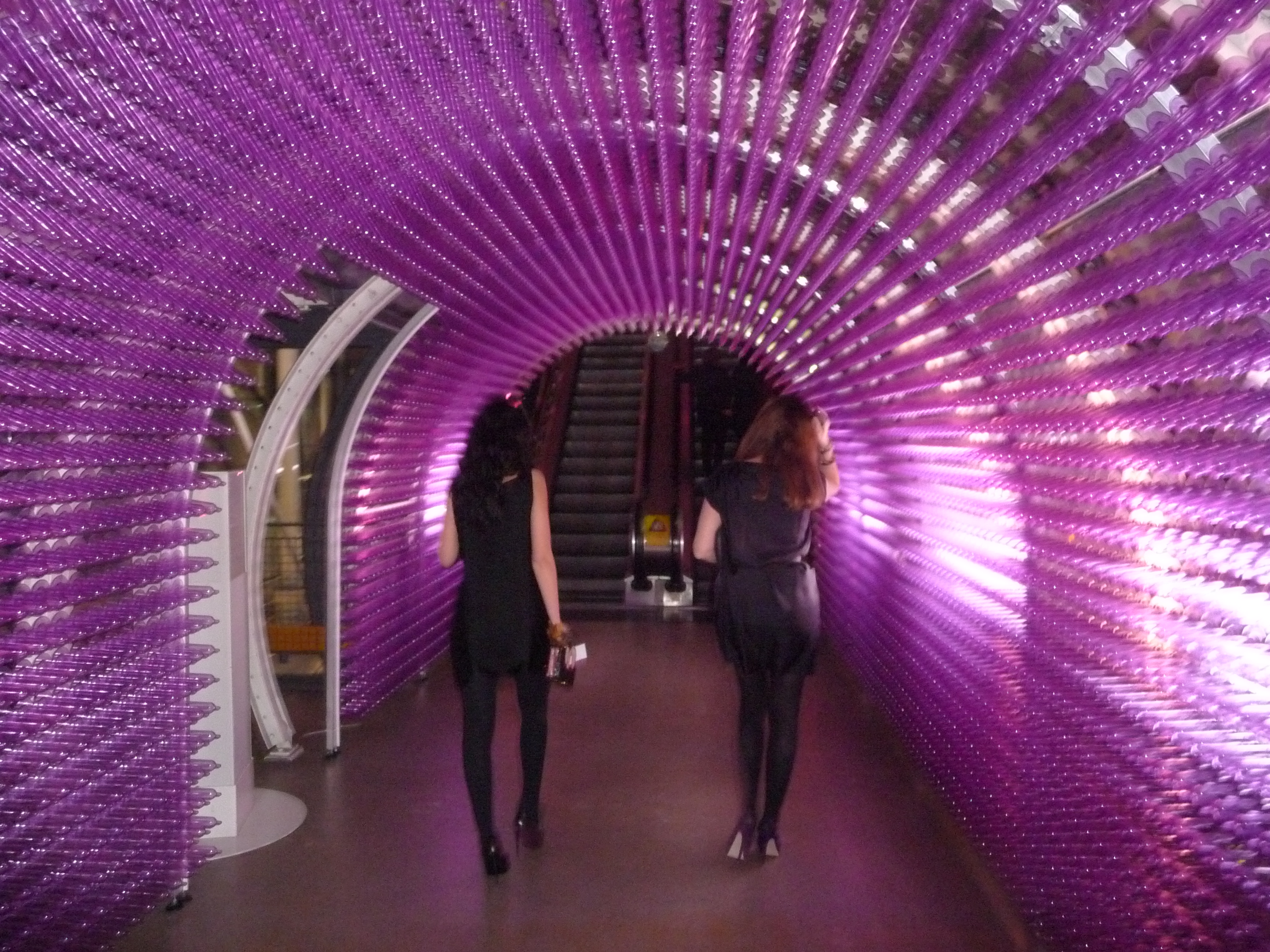 Pour monter jusqu’au sixième étage, les centaines d’invités ont eu le privilège de  passer sous les arcades tendues de milliers de préservatifs colorés sur fond de coeur qui bat, le tout  imaginé par l’artiste irlandais Bryan Mc Cormack .