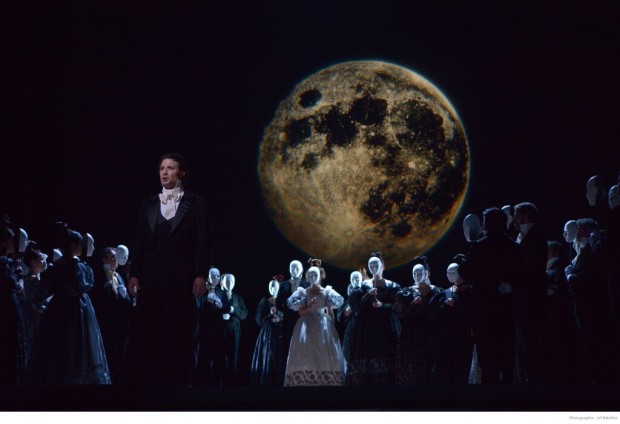 Certaines productions ne font pas leur âge, et celle d’Eugène Onéguine réglée par Alain Garichot appartient à celles-là. Créée pour l’Opéra de Lorraine en 1997, sa sobriété intemporelle lui a permis de garder toute sa fraîcheur jusqu’à la reprise nantaise de ce mois de mai. Une forêt de troncs nus qui délimitent la campagne provinciale avec ses pastels à dominante crème, une lune qui porte son gigantesque globe cratérisé sur la fête pétersbourgeoise au troisième acte : la scénographie dessinée par Elsa Pavanel constitue un écrin intimiste et fluide pour l’opéra de Tchaïkovski, et trouve au Théâtre Graslin les dimensions idéales pour s’exprimer. A l’heure où certaines lectures privilégient l’iconoclasme, le spectacle d’Alain Garichot cultive une qualité rare autant que précieuse sur les scènes aujourd’hui : l’humilité envers l’œuvre, qui ne doit point se confondre avec l’illustration superficielle. Et de fait, le graphisme comme la direction d’acteurs ne verse jamais dans la vanité, ni la vacuité : la chute de feuilles de papier quand Onéguine se rend compte, chez son ami Grémine, qu’il aime Tatiana, rappelle la scène de la lettre des années auparavant, où les sentiments de la jeune femme n’avaient pas rencontré d’échos auprès du dandy. Une sensibilité très narrative affleure dans les moindres détails, sans chercher à dépasser l’intelligence du texte : un exemple accompli d’émouvante simplicité.