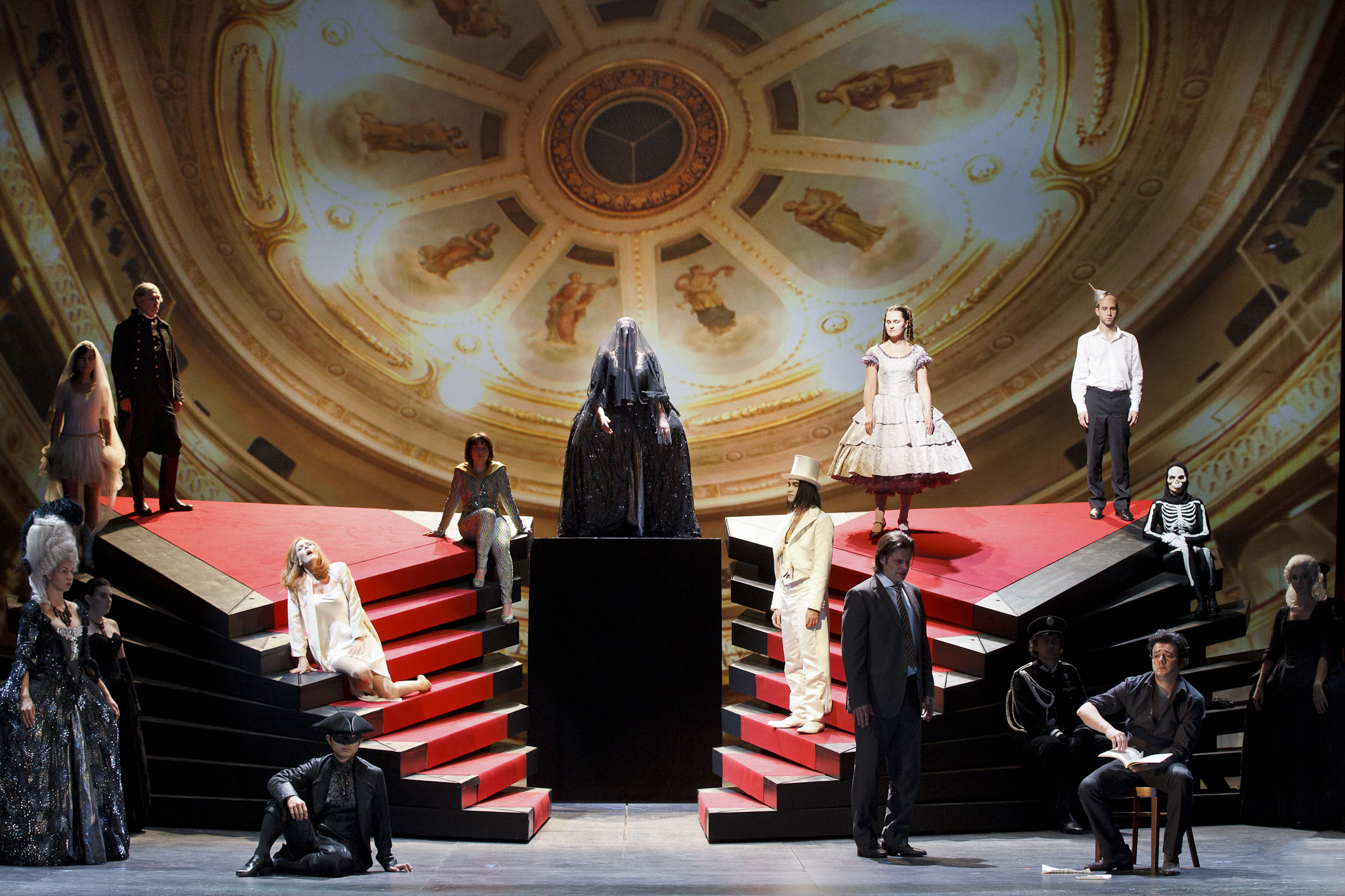 Quelques semaines plus tard, le même Theater an der Wien proposait un autre classique, français cette fois, avec Les Contes d’Hoffmann d’Offenbach. Les mânes de Robert Carsen semblent s’être penchés sur les planches de Roland Geyer, comme la longue table de beuverie devant une reproduction d’un Arcimboldo du Musée des Beaux-Arts voisin ou la projection du plafond de la salle du Theater an der Wien, effet de miroir dont le canadien se montre particulièrement friand. Sans être une mauvaise idée, les figurants de mascarade auxquels on a fait appel relèvent cependant plus du gadget que d’une véritable direction d’acteurs..