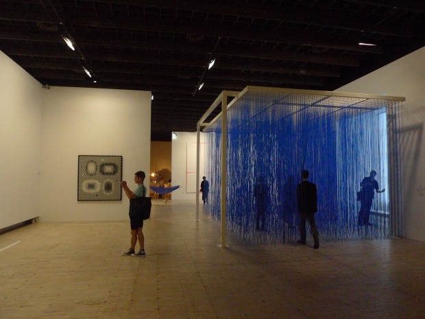 « L’oeil humain est notre point de départ » affirmait le groupe GRAV tandis que pour Jean Tinguely, « l’unique chose stable c’est le mouvement, partout et toujours »; voilà qui est résolument vérifiable avec des oeuvres tantôt interactives qui font du bruit quand on les touche, des miroirs ou formes qui évoluent dès que l’on se déplace. Ça pétille, ça tourne, ça brille, ça clignote, à vous faire croire d’être sous LSD! Heureusement de grands canapés noirs tout au long du parcours permettent de reprendre ses esprits…Et cheminer jusqu’aux dernières galeries, beaucoup plus sages avec les « pionniers » – Delaunay, Kupka, Duchamp, Richter, Calder ou Rodtchenko qui paraissent bien sages en comparaison… A noter, pour la première fois, une application smartphone a été créée avec Orange pour pouvoir gratuitement accéder à des informations sur certaines oeuvres, poster des commentaires sur le site du Grand Palais ou sur les réseaux sociaux. L’art interactif est né!