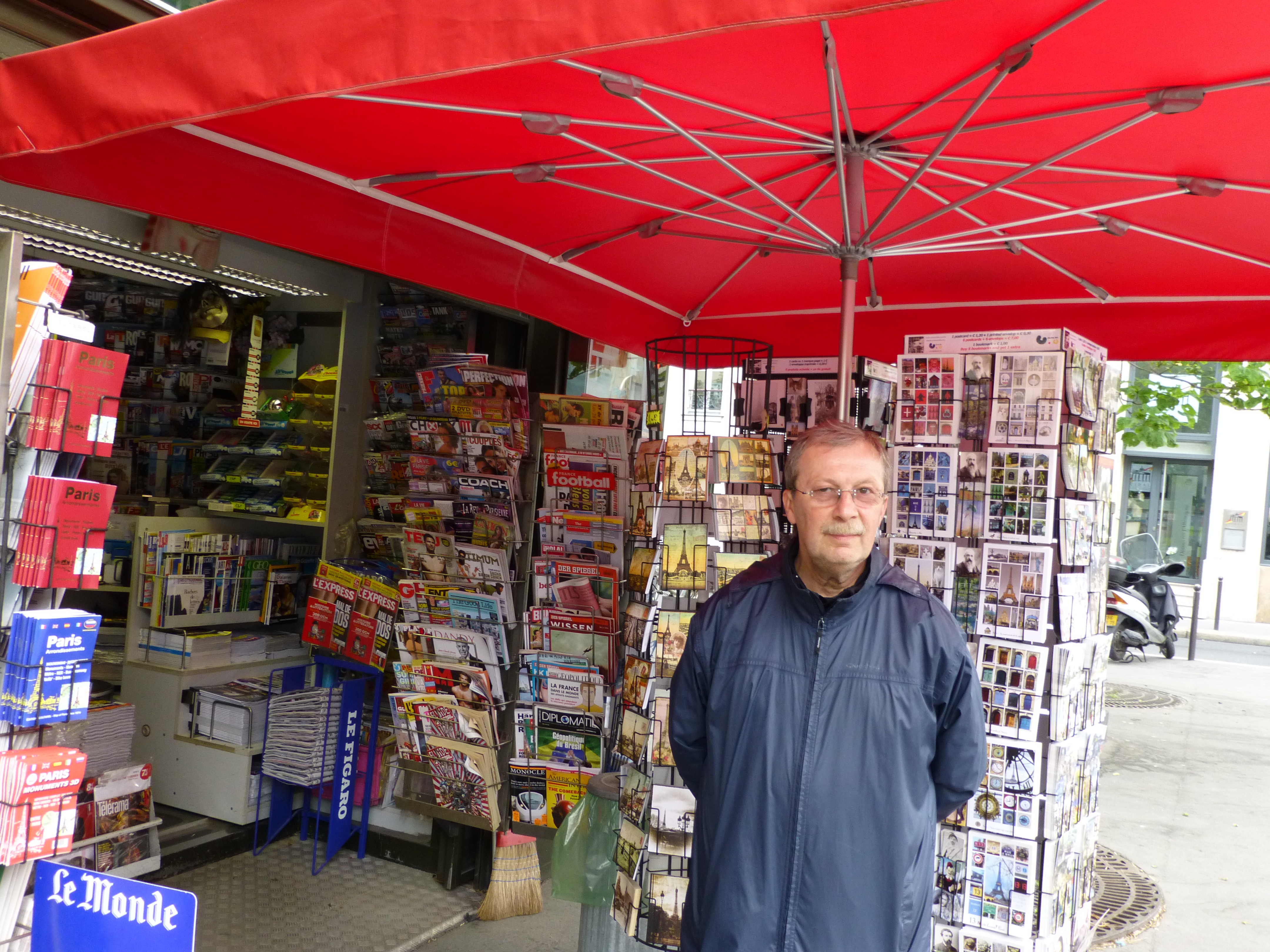 Il a des allures de marmotte. Un bermuda avec des chaussettes hautes lorsqu’il fait un peu frais et que l’on peut le voir autrement qu’en homme-tronc derrière sa pile de magazines. Tout les sénateurs le connaissent, les habitants du quartier aussi, certains mieux que d’autres avec à l’occasion, le privilège de ses conseils de lectures. Pas de journaux, ah non, mais de livres, le plus souvent de philosophie, lus entre deux clients. André est kiosquier depuis presque dix ans, occupant celui face au Sénat depuis 1998. Un métier qui peut mener à l’écriture comme Jean Rouaud- merveilleux prix Goncourt avec Les Champs d’honneur, au cinéma, avec une belle humanité comme pour François Cluzet dont le père exerçait ce beau métier ou à une observation implacable de notre société. Voici la sienne, donnée sur le vif, dans le café d’en face, Le Tournon où il prend chaque matin un allongé en saluant par son prénom la serveuse.
