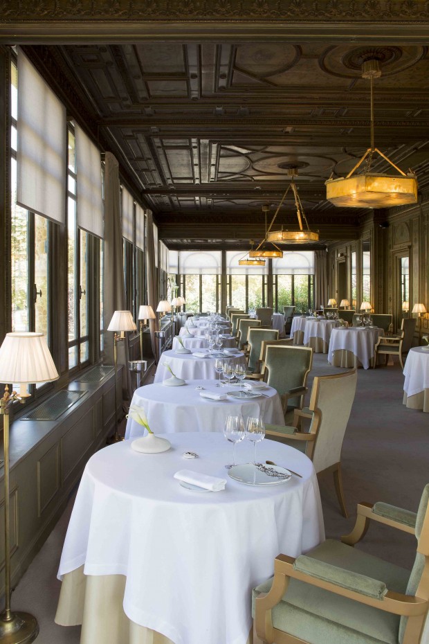 Pour qui a vu le film Le grand restaurant, sorti en 1966, c’est avec le sourire aux lèvres qu’il pénétrera dans ce petit hôtel particulier datant de 1792 où  15 tables attendent de vous hypnotiser les papilles. Salon beige, orchidées blanches, porcelaine de Bernardaud, la salle de restaurant située au premier étage du Pavillon  Ledoyen a de quoi séduire, surtout avec sa vue sur le Grand Palais. Parce qu’ en ce moment, côté Concorde c’est plutôt caravanes et baraque à churros, Noël populaire oblige…Vous ne pourrez donc pas retrouver le salon où Louis de Funès martyrisait son pianiste ou son maître d’hôtel d’autant que le film a été en grande partie filmé en studio. Reste qu’avec l’arrivée de Yannick Alléno en septembre dernier, c’est le terroir et le talent qui débarque dans cette institution jusqu’à présent un peu ronronnante. A la carte, toute la gastronomie française version moderne pour un menu déjeuner à 250 euros-prévoir la sieste après- à moins que vous n’optiez pour du tout truffe. Et contrairement à Monsieur Ducasse ou Monsieur Passard, la viande est encore ici à l’honneur car « Monsieur Alléno est dans la tradition française du saucier » glisse un commis de salle; on trouve donc encore poularde, ou noisette de chevreuil en croute d’argile comme pour le menu réveillon du 31 décembre où il faut quand même compter près de 1000 euros par tête-mais rassurez vous, vin compris.