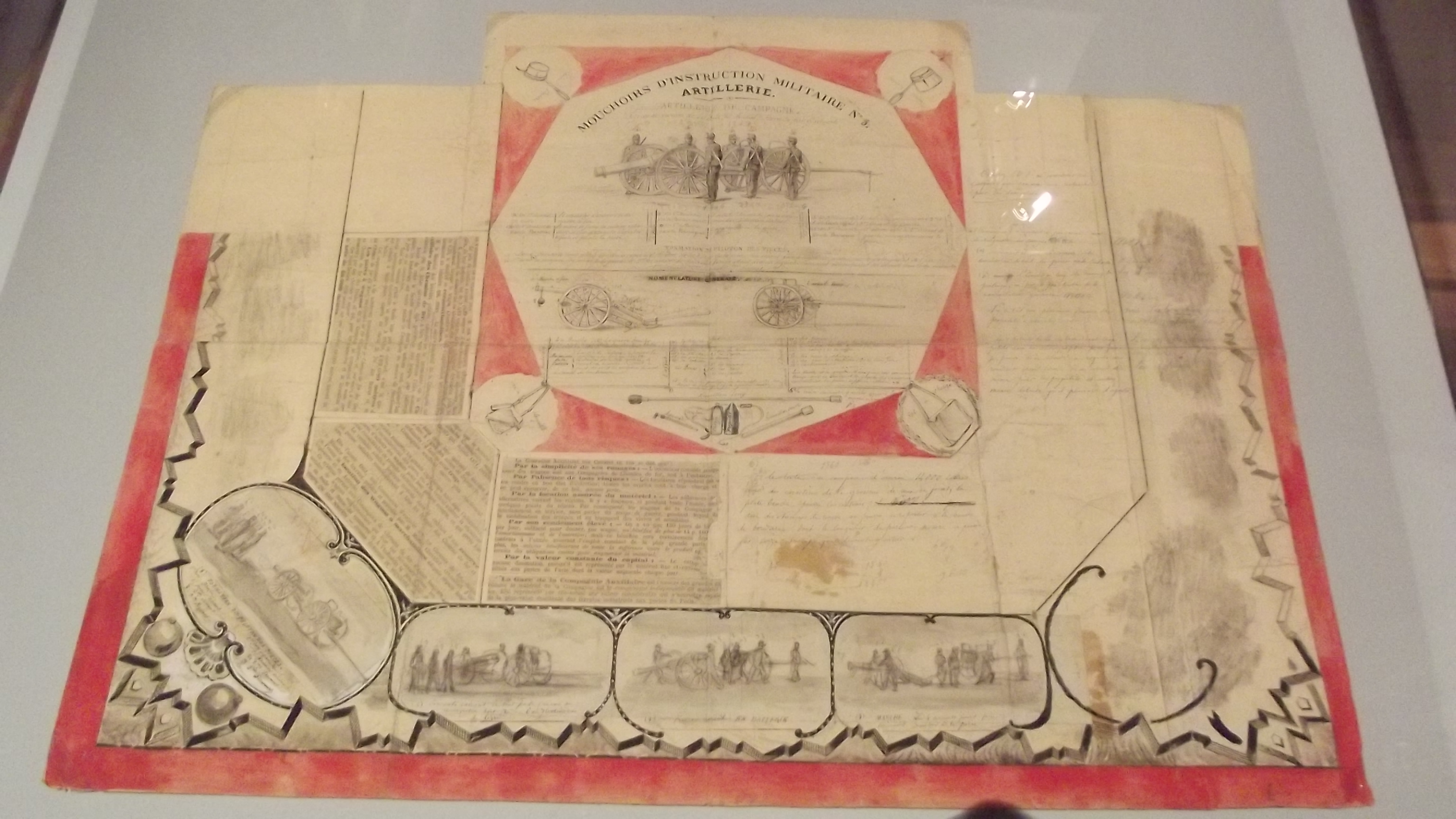 Des mouchoirs en veux-tu, en voilà ! Le musée de l’Armée, lieu ô combien prestigieux, accueille jusqu’au 13 janvier 2013 un objet bien trivial -tout du moins en apparence-…le mouchoir ! Si de prime abord, le lien entre cette institution et ce tissu n’est pas évident-on en conviendra aisément, il faut découvrir l’exposition pour comprendre que la corrélation est beaucoup moins fortuite qu’elle en à l’air, en permettant de plonger en plein cœur de la société militaire et civile du milieu du XIXe siècle à l’entre deux guerres. Originellement destiné à la commodité corporelle, l’usage premier du mouchoir a été, au fil du temps, détourné à des fins pratiques. Il devint un support d’image de propagande dans un premier temps, à la gloire de Napoléon Ier notamment, avant d’être imprimé d’images narratives et destiné à la formation des jeunes recrues à la suite de la réforme de la conscription en 1872, période durant laquelle « la présence de l’armée marque le paysage urbain ». Ces mouchoirs d’instruction deviennent de véritables outils d’apprentissages didactiques : comment cirer ses chaussures, démonter un fusil, panser ses plaies, etc.