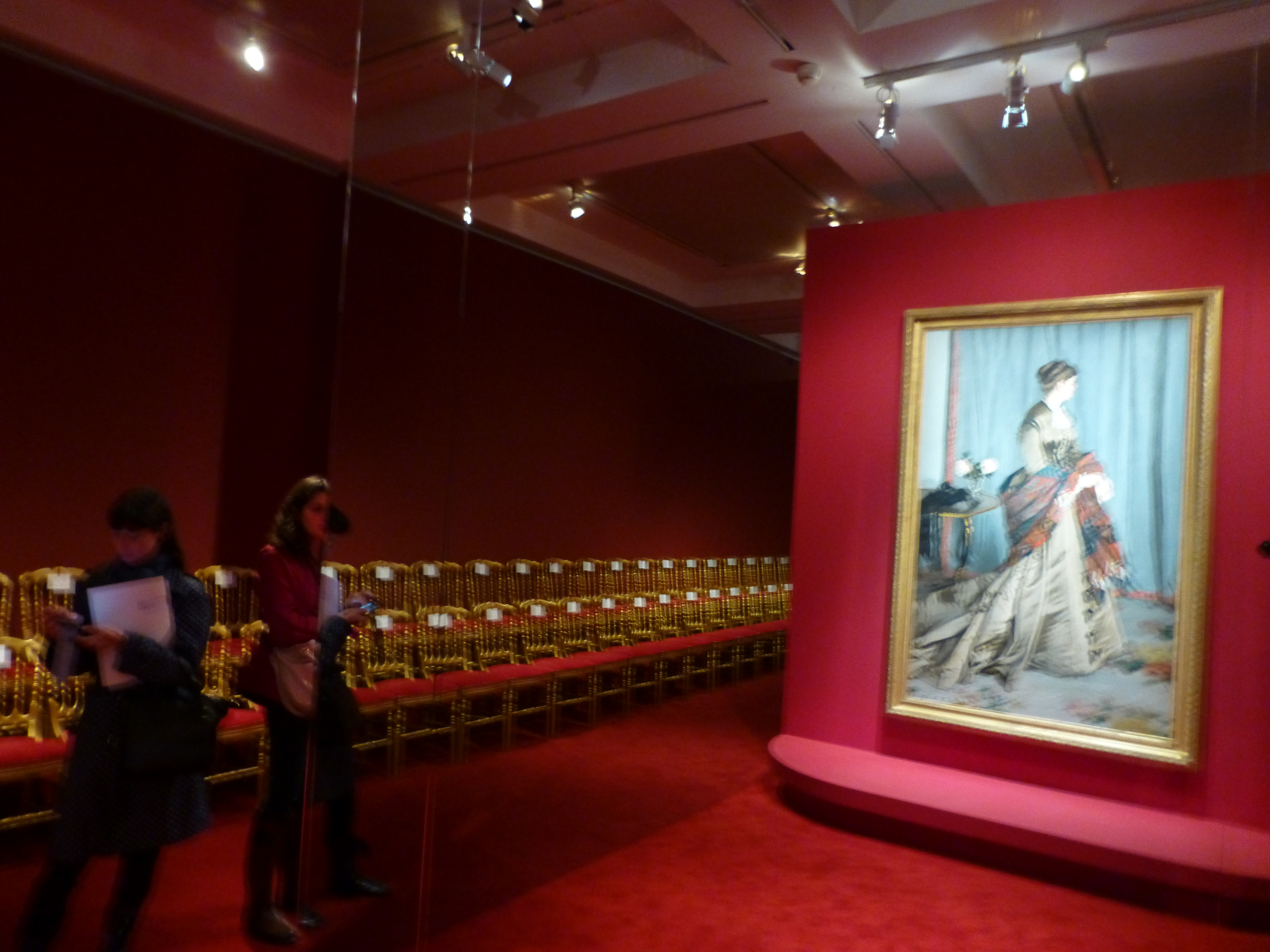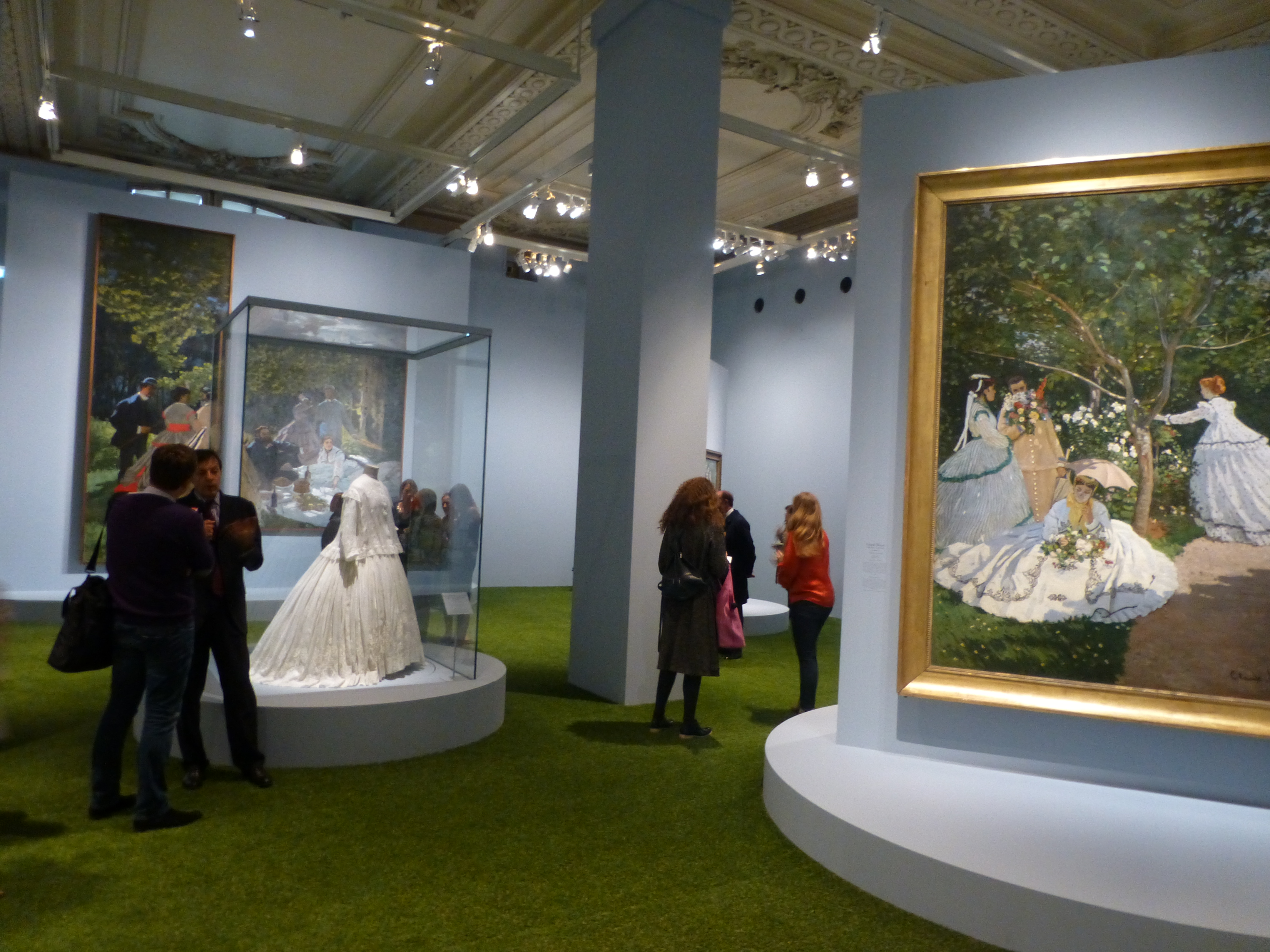 Alors pour cette femme -là qui n’existe plus qu’en peinture, sublime d’élégance  comme la comédienne Ellen André en robe noire à traine sous le pinceau d’Edouard Manet, Carsen a imaginé un « catwalk », moquetté de rouge avec un front-row de rêve,  Monsieur Charles Baudelaire, Madame la Comtesse de Galliéra, le Comte de Lautréamont, ou encore Monsieur Louis Pasteur. Et comme à cette époque, « on ne sortait pas en cheveux », une salle entière est consacrée aux chapeaux, merveilleusement conservés par le Musée Galliera, accessible par un couloir consacré aux dessous-corsages, corsets, jupons à queue et bas qui semblent jetés à même la vitrine en parfaite résonance avec le tableau d’Henri Gervex, Rolla où une femme nue alanguie avec son amant a abandonné  sa lingerie par terre. Le dandy est lui aussi mis en valeur avec des vitrines où des accessoires ont été avec minutie rajoutés comme les malles Vuitton, les flacons Guerlain, autant d’objets nécessaires à cet homme « dont la distinction résidait dans sa simplicité absolue, qui est la meilleur façon de se distinguer » comme l’écrivit Baudelaire-en connaisseur. Apothéose, la dernière salle accueille Le déjeuner sur l’herbe de Monet et toutes ces scènes d’extérieur avec idée géniale, du faux gazon au sol et une extraordinaire hauteur de plafond, jusqu’ici inconnue. C’est en effet ici que débutait généralement les expositions; Carsen a lui choisit d’inverser le sens pour offrir une  « cathédrale » à des toiles ô combien célèbres, où le public semble évoluer comme dans un jardin. « Sans lui, il ne se passe rien » conclut Carsen qui procède en ce jour réservé à la presse aux derniers réglages avec une minutie propre à ceux qui savent que le diable se cache dans les détails; ainsi ces airs de piano de César Franck qu’il a réussi à imposer dans la salle où deux femmes peintes par Stevens et Renoir jouent elles- même au piano tandis que la fraicheur de la dernière salle accueillant le déjeuner sur l’herbe et autres scènes d’exterieur, du fait de son absence de plafond,  vous donne l’impression d’être effectivement dans un jardin. Du grand art et une délicieuse promenade à vous offrir jusqu’au 20 janvier 2013.