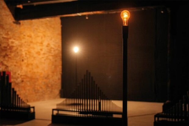 Cette immersion sonore et spatiale est également au cœur de l’installation de Maxime Denuc, Elevations, coproduit par des institutions françaises et belges, et qui voyage pour la première fois en Italie. Au rez-de-chaussée de l’Arsenal, dans une des salles d’armes, l’auditeur se trouve face à des sculptures éphémères d’orgues alignés derrière une petite balustrade, à la manière d’un petit autel, tandis que des boucles hypnotiques de cet instrument associé à l’église baignent la pièce plongée dans une lumière modulée par Kris Verdonck, de l’obscurité à la douceur de l’aube.