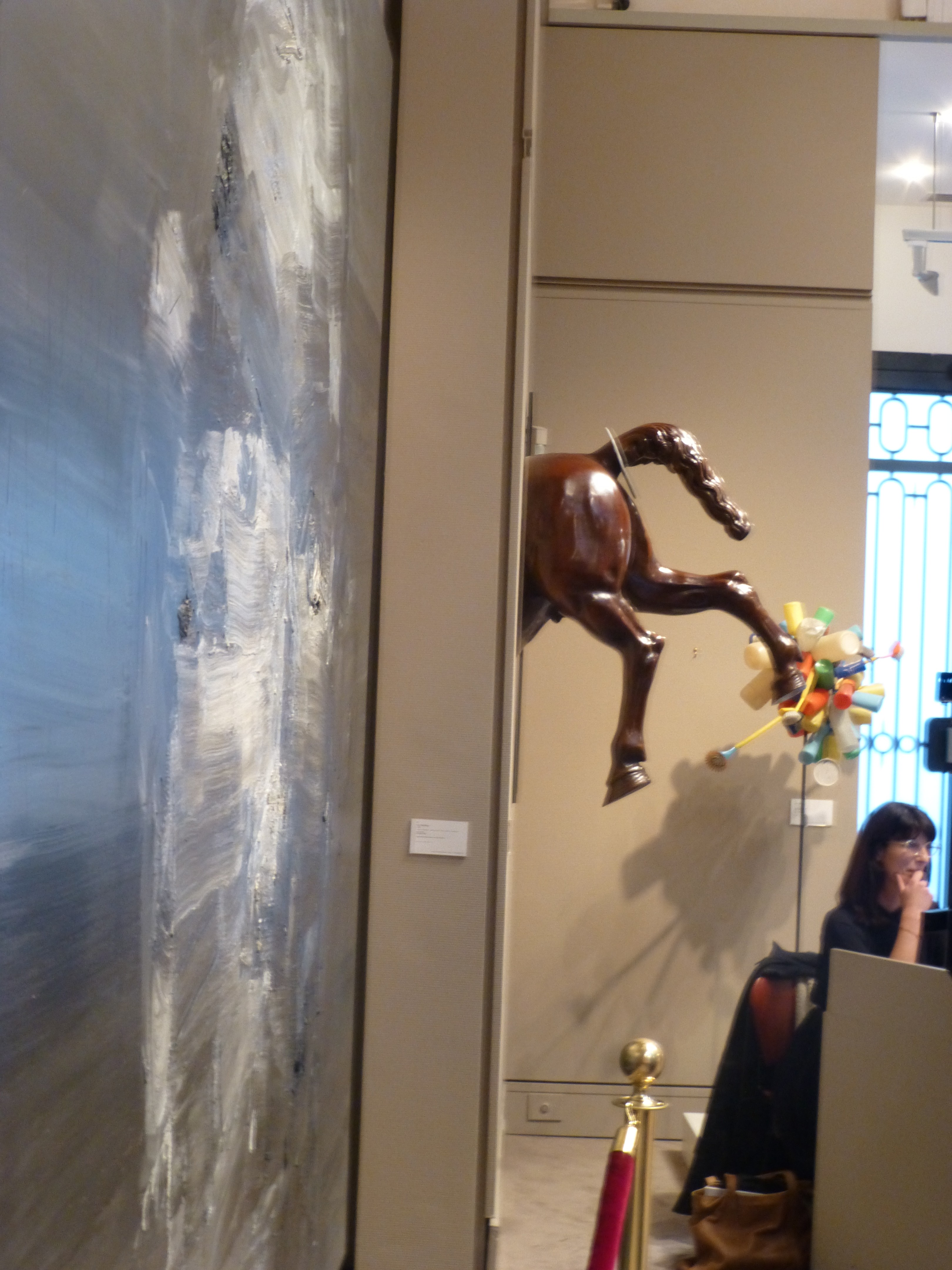Marcel Brient fut un génial collectionneur; la dispersion de ses oeuvres en témoigne, ce lundi 24 septembre dans l’élégant salon de la maison Sotheby’s, rue du Faubourg Saint Honoré, non loin de l’Elysée. Beaucoup de monde, un chien et Nathalie Rykiel-fine amatrice d’art-pour prendre place dans la salle où sont accrochées de grands formats- une belle composition de Raymond Hains, des tissus agraphés de Gérard Deschamp, un panneau en bois de Jean Pierre Raynaud, de très belles affiches lacérées de Jacques Villeglé ou encore Arman, Nikki de Saint Phalle et une étude de Simon Hantaï qui atteindra les 720 000 euros, record de la soirée. Mais pour l’instant les chaises encore se remplissent avec un premier constat amusant: ici, ce sont les derniers rangs qui sont réservés…afin de conserver son anonymat. Les têtes se tournent ainsi en tous sens pour voir qui a enchéri, tandis que les raquettes-le morceau rond en plastique sur lequel est inscrit votre numéro restent très discrètes. Au téléphone, près de 14 collaborateurs prêt à crier « enchère » tandis que le personnel s’affaire autour de vous avec cette sollicitude qu’ont les gens habitués aux clients « difficiles ». Pas question ainsi de commettre un impair et se fâcher avec un bon client ou son acheteur anonyme. Il est en tous cas délicieux de poser le regard sur des oeuvres qui ont toutes ce « quelque chose » auquel on reconnait les grandes collections. Marcel Brient, breton, âgé de 72 ans n’est pas dans la salle mais le regard qu’il a porté sur l’art, y est assurément comme cette poussette emballée par Christo ou cette croupe de cheval sortant d’un mur de Jean Michel Alberola.