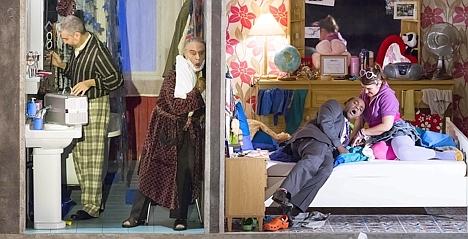 Mais le mur d’intérieurs et la simultanéité d’intrigues dessert le second acte, sans parler de certaines contradictions avec le livret – on se prend de nostalgie pour l’inventivité sans prétention de Colline Serreau. L’histoire de Berta dépressive donne trop de place à ce personnage somme toute anecdotique, et le misérabilisme de ses amours n’apporte guère à l’intrigue qui du coup se desserre quelque peu.