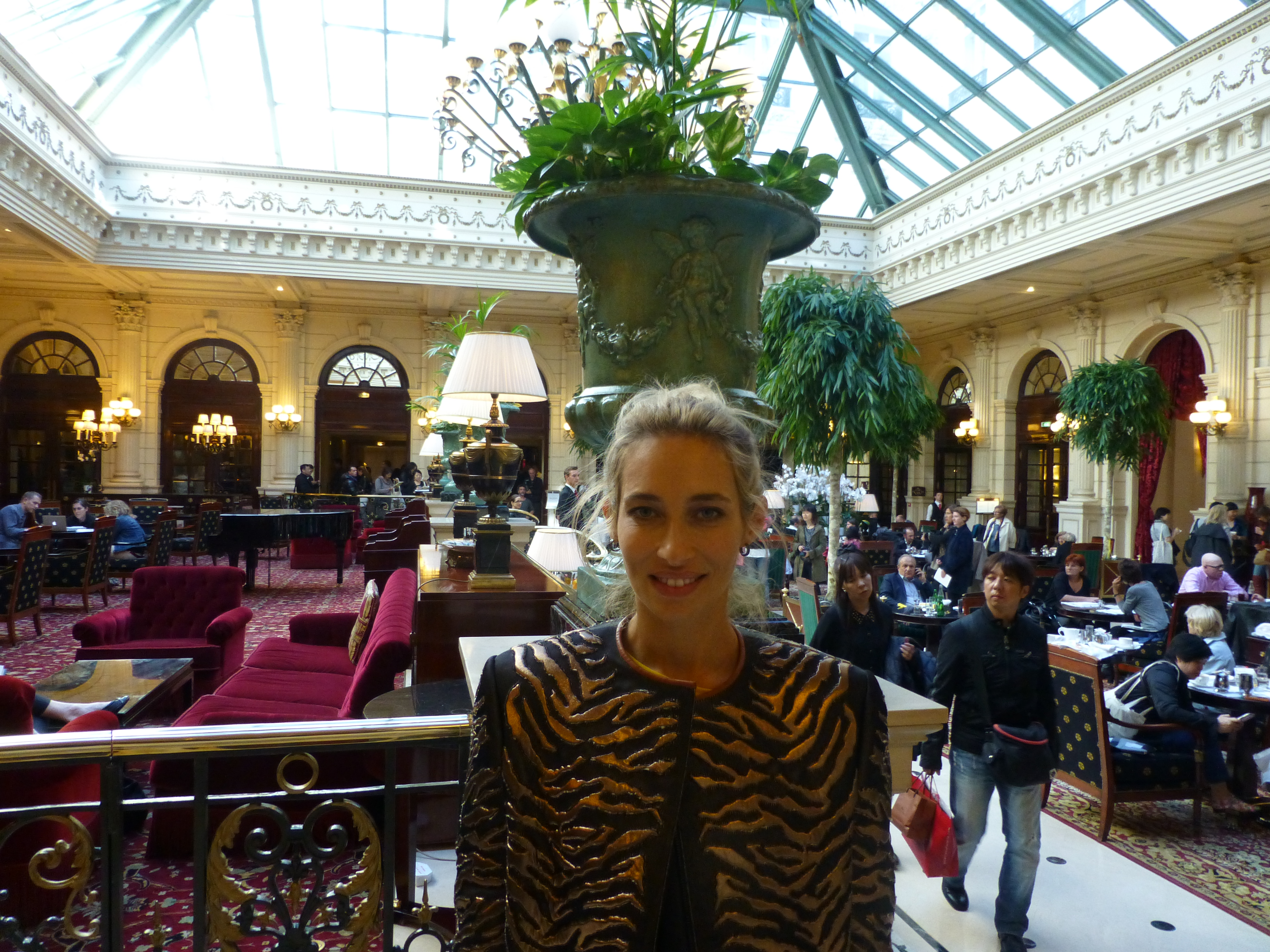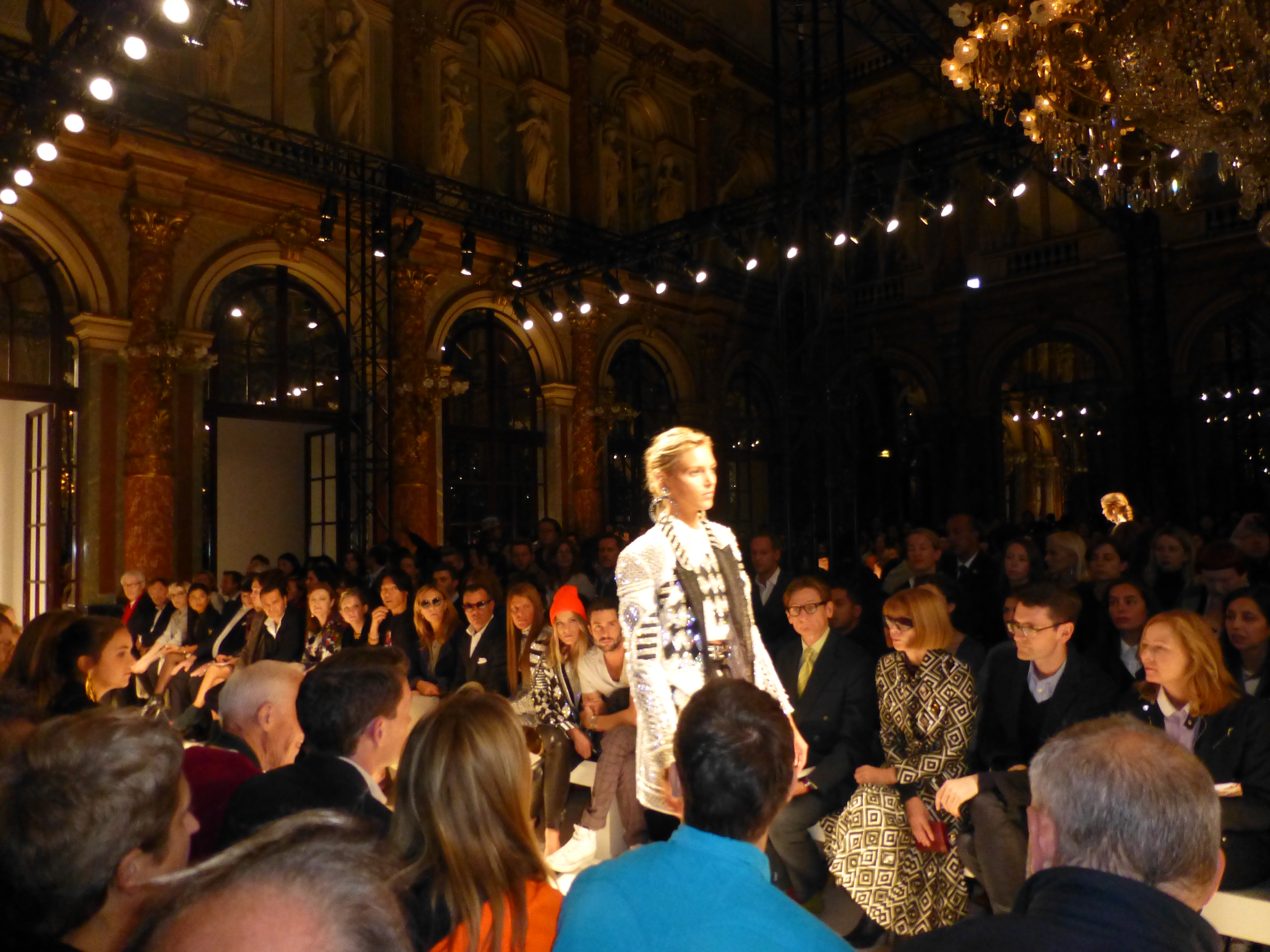 Il est une tradition intéressante dans les défilés de mode, c’est le standing. Grâce à cela vous pouvez entrer dans la salle sans place attitrée et occuper généralement au dernier moment un des sièges laissés libres par un acheteur en retard ou une rédactrice épuisée. Et ainsi vous retrouver comme chez Balmain au Grand hôtel face à Ana Wintour, élégantissime as usual dans son tailleur à motifs cinétiques qui dès les sunlight allumés chausse ses lunettes noires. L’ occasion de voir ce que c’ est que d’ être shootée et re-shootée sous tous les angles, telle une icône absolue et inoxydable des Fashion week et rendue célèbre à tout jamais par Le Diable s’habille en Prada. Et tant pis si ce matin, elle s’est trouvé mauvaise mine…Le monde de la mode est sans pitié, installé sur des larges bancs pour voir défiler des modèles sous les dorures du sublime salon Napoléon III ô combien proche en distance et en style du Palais Garnier. Un écrin pour des robes en maille brillante tenant plus de la haute couture que du prêt à porter et cette question: le créateur a-t’il oublié que l’été, il faut souvent chaud et qu’un bon coton ou une toile de lin est sur la plage ou sous le soleil pour le moins bienvenu? Pas vraiment des tenues confortables donc mais le savoir-faire de la maison est bien là avec cette idée d’en mettre plein la vue et de s’adresser sans doute à des jeunes russes qui veulent que ça brille. Les inspirations? On ne les connaitra pas en l’absence d’ un dossier de présentation quelconque; ici, il faut regarder, c’ est tout.