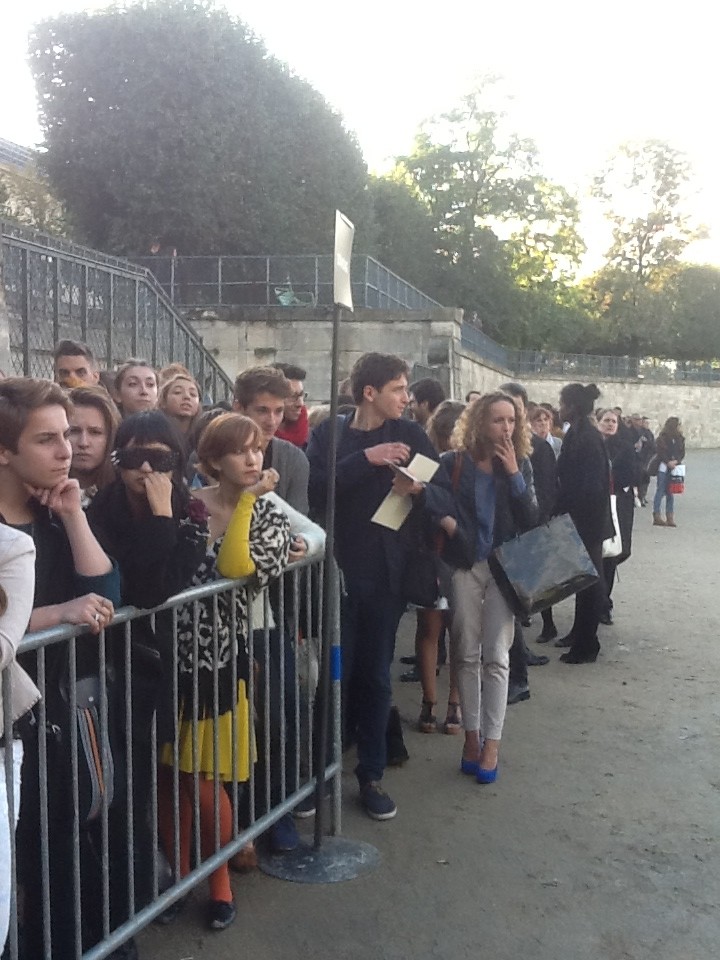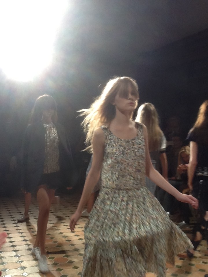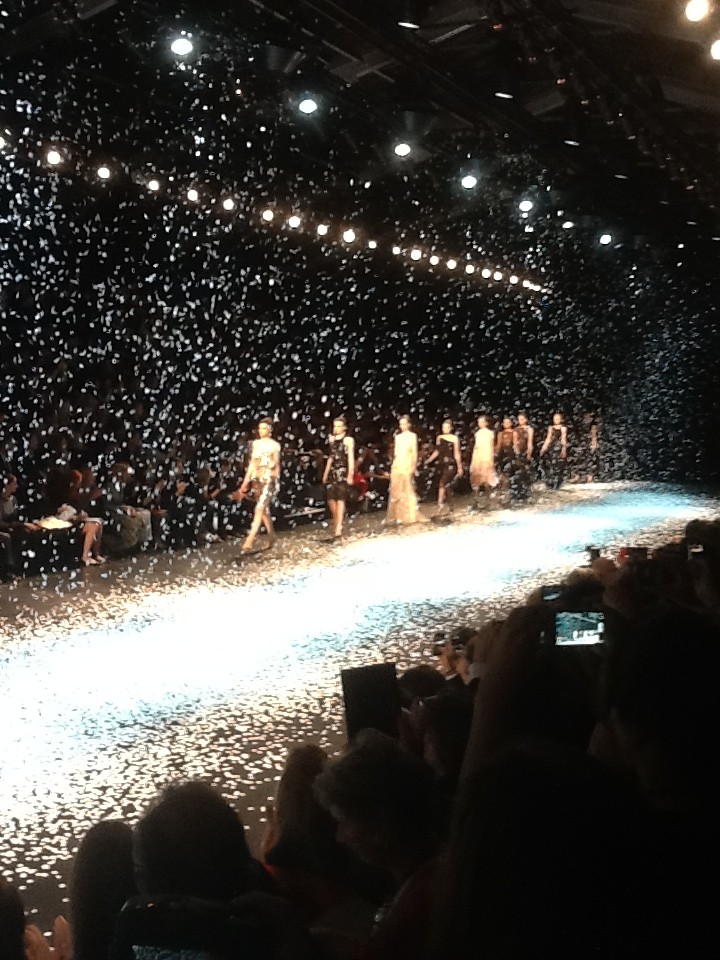 Avec 3/4 d’ heure de retard et la bonne idée d’ avoir installé un tapis en feutre blanc sur le sable des Tuileries pour éviter de ruiner les chaussures de ces dames, Nina Ricci défile enfin-tous les standing même sans invitation faisant la queue sont rentrés- dans cette tente aseptisée et éphemère, sur un tapis de neige. Enfin, vu que c’est un défilé printemps-été, c’est plutôt l’idée de pétales blancs tombés du ciel, un peu trop lentement de l’avis des photographes serrés les uns contre les autres, apparemment peu enclins à goûter la poésie de l’instant présent… C’ est donc après 5 minutes que l’un d’eux salua d’un ironique » Génial » que les mannequins défilèrent avec du noir en entrée-silhouette très moderne et sautoir en pagaille, imper en nylon transparent, robes à franges ou en mousselines, très aériennes , vestes déstructurées, tissu à pois familier de la maison ou jupe avec de fines fermetures éclair dorées et robe imitant les bretelles pour hommes. Une collection vraiment jeune et inspirée , très aériennes et donnant envie de voir les premières chaleurs arriver. Et Ana Wintour dès la lumière éteinte de se lever pour telle une fusée, aller backstage se réfugier (elle a déjà dû en avant première féliciter…).
